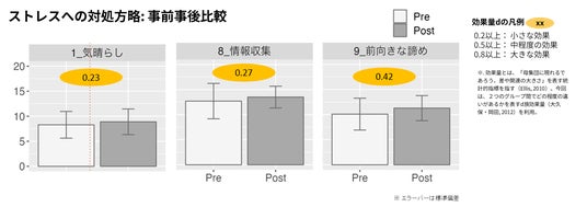 ※ストレス対処方略はストレスコーピング尺度はTAC-24 (神村他, 1995)に「前向きな諦め」項目を追加したものを使用。うち適応的なストレス方略かつ効果量が認められた項目を抜粋して掲載