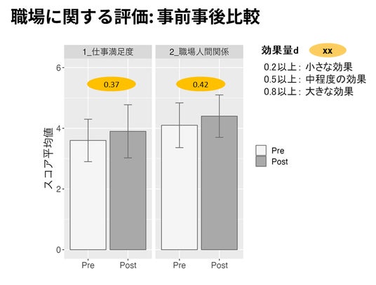 また、仕事満足度や職場の人間関係に対する6段階評価の質問への、プログラム前後での参加者の回答でも統計数値上の変化が示唆されました。