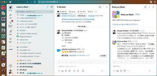 右上隅のAIエージェント呼び出しボタンをクリックすると、右カラムにParty on Slackが呼び出され、ここから生成AIを呼び出し活用することができます。