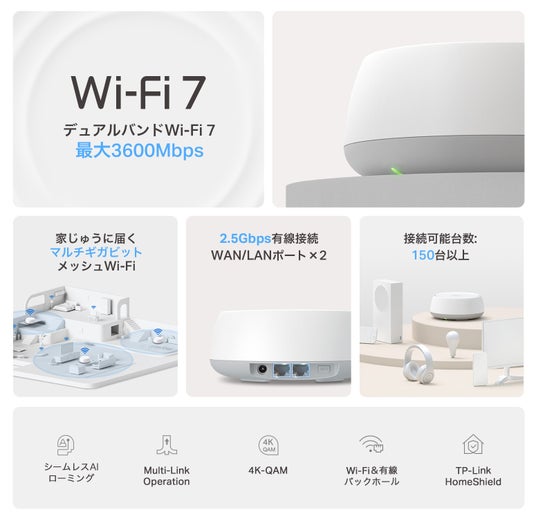 - シームレスAIメッシュ: お家の中を移動しても常に快適なWi-Fi接続を維持できます。
