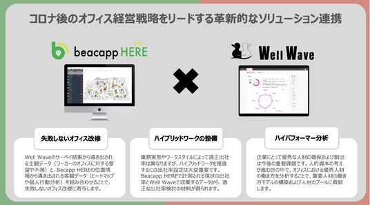 屋内位置情報サービス累計導入社数No.1※1の「Beacapp Here」を提供する株式会社ビーキャップ(東京都港区、代表取締役社長 岡村 正太、以下「ビーキャップ」)とサーベイとダッシュボードを活用してワーカーのWell-being向上に寄与する「Well Wave」を提供する株式会社Duck Dive(東京都品川区、代表取締役社長 關 倫太郎、以下「Duck Dive」)は、ワーカーの生産性向上の実現に向けたプラットフォーム創造を目指して業務提携を開始しました。