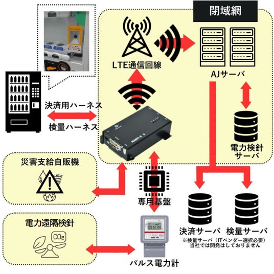 当社の通信機器「NABIT-SII」では、「QR決済」と「自動販売機の売上オンラインデータ」の同時処理を閉域網ネットワークで実現しました。また、自動販売機で使用される電力量従来の目視による検針を不要とし、遠隔で検針を行うことができます。電力量計の10年検定期間もシステム管理が可能です。そして、災害が発生した際には、遠隔操作で自動販売機から清涼飲料水の無償提供が可能な災害ベンダーに切り替えることができます。