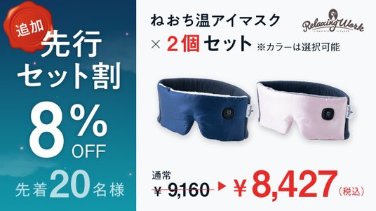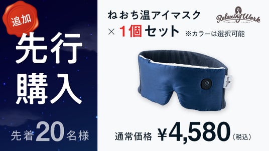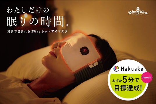 シリーズ累計80万個を販売したセルフケアブランド「リラクシングワーク」の手がける「ねおち温アイマスク」がMakuakeプロジェクト開始5分で目標金額を達成。好評につき数量限定で追加リターンが決定。