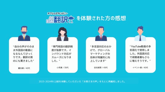 株式会社ベクトル(本社:東京都港区、代表取締役会長兼社長:西江 肇司、東証プライム:6058、以下ベクトル)のグループ会社である株式会社オフショアカンパニー(本社:東京都港区、代表取締役:野呂 健太、以下オフショアカンパニー)は、2024年10月10日(木)より、動画を活用した企業のグローバルコミュニケーションの支援を目的に、話者の音声をそのまま合成し、50カ以上の言語に対応する多言語動画音声翻訳サービス「AI動画翻訳くん」の提供を開始したことを、お知らせします。