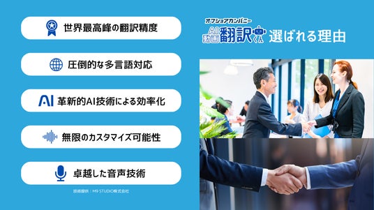 また、動画において、世界最高水準の翻訳精度95%超を誇り、話者の音声をそのまま合成し、50カ国以上の言語に対応するサービスは日本初となります。「AI動画翻訳くん」は、M9 STUDIO株式会社(以下「M9 STUDIO」)の技術提供のもと、オフショアカンパニーがもつ最新AI技術により独自開発したサービスです。