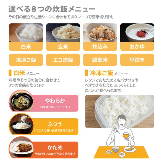 ~ 簡単操作で食べたいごはんを炊き分けできる! 選べる8つの炊飯メニュー ~