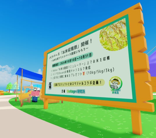 農業×web3を推進するコミュニティ、Metagri研究所(運営:株式会社農情人、本社:千葉県船橋市、代表取締役:甲斐雄一郎)は、メタバースプラットフォーム「Roblox」で展開する農業ゲーム「未来の農業シミュレーター」を舞台に、2024年10月10日から10月31日までの期間、「お米収穫祭 in メタバース」を開催いたします。(*1)