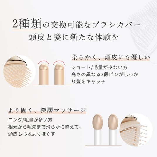 柔らかいコームブラシとマッサージブラシの2種類を搭載。頭皮を心地よくマッサージしながら、髪を優しくとかし、健康な髪へと導きます。