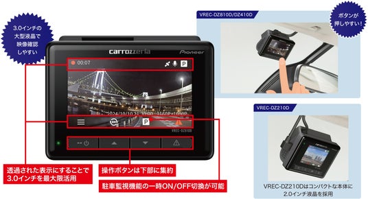 ※2 「VREC-DZ810D/-DZ410D」は、別売の駐車監視ユニット「RD-DR002」(2,970円/税込)を取り付けることで最大24時間365日、「VREC-DZ210D」は、別売の駐車監視ユニット「RD-DR001」(6,600円/税込)を取り付けることで最大12時間の駐車監視が可能です。