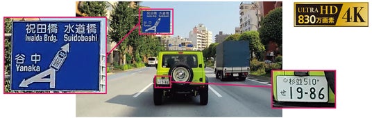 一般的なフルHD(約200万画素)と比べ、約4倍(約820万画素)の高解像度4K録画に対応。ナンバープレートや看板の文字、周辺の状況に至るまで、高画質で鮮明な映像記録が可能です。