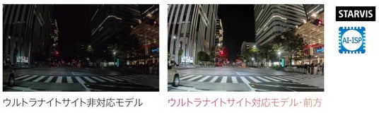 フロントカメラは、高感度・高画質を実現するSONY製CMOSセンサー 「STARVIS(TM)」と当社独自の画像認識・処理の知見を活かした「AI-ISP(Image Signal Processor)」を組み合わせた「ウルトラナイトサイト」に対応。独自の機械学習アルゴリズムで運転シーンやノイズ特性に合わせた画像チューニングを行い、夜間の走行や暗闇の駐車場でもコントラスト豊かなメリハリのある映像を記録できます。また、リアカメラは高感度録画「ナイトサイト」に対応。トンネルや夜間の走行時でも、前後のカメラで鮮明な映像を記録できます。さらに、フロントカメラとリアカメラそれぞれに露出補正機能を装備しており、個別に明るさを調整(9段階)できるので、リアガラスがスモークガラスの場合でも後方の映像をしっかり録画します。
