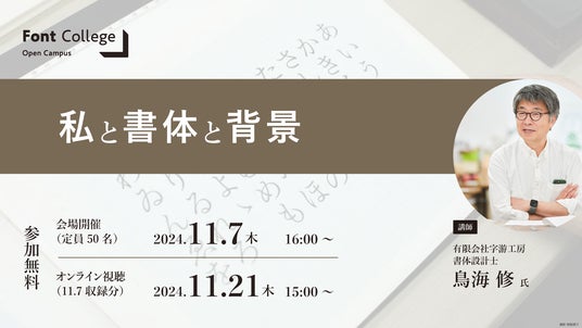 株式会社モリサワは、Font College Open Campus(以下FCOC)16「私と書体と背景」を2024年11月7日(木)に会場参加型で開催、およびその様子を収録した動画をご覧いただくオンライン視聴を11月21日(木)に実施します。