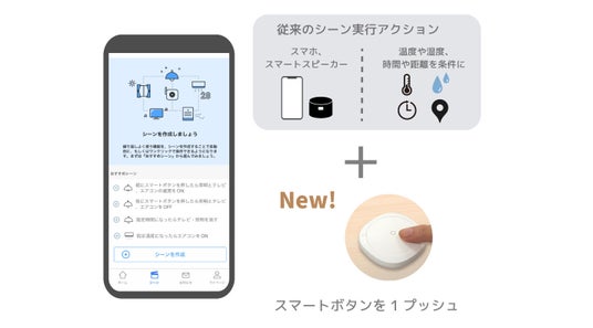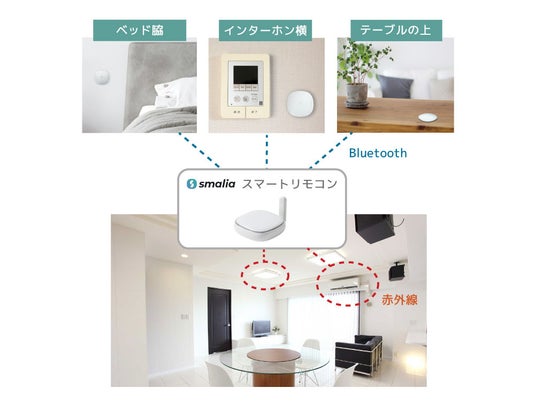 smaliaスマートリモコン(別売品)は、「スマホ」「スマートスピーカー」「温度、時間などの条件」で家電が操作できるようになる製品です。専用オプションである本製品を追加することで、「スマートボタン」による一括操作も可能となります。