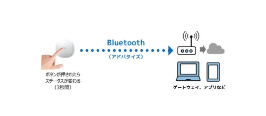 本製品のアドバタイズ信号では、ボタン入力や電池残量のデータ取得が可能。ボタンプッシュをトリガーにした家電操作や通知送信などに活用いただけます。