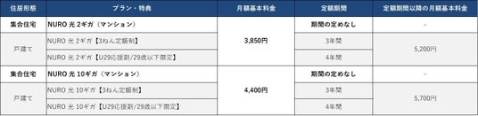 なお、戸建てプランの「NURO 光」においても、現在提供中の3年間定額で利用できる特典「3ねん定額割」や、29歳以下を対象に4年間定額となる特典「U29応援割」を新規で申し込むと、「NURO 光(マンション)」と同一の料金で利用できます。