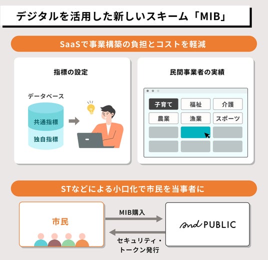 アンドパブリックは民間企業に対するコンサルで培った知見やデータを生かし、中長期的には地方行政の改革のサポートに取り組む計画です。自治体がインパクト志向で政策を立案するよう促すと同時に、デジタルな金融手法を用いて市民の参加を促す独自のスキーム「マイクロインパクトボンド(MIB)」を社会実装し、地方自治OSのアップデートを目指します。