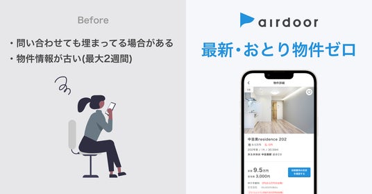 株式会社エアドアは(本社:東京都渋谷区、代表取締役CEO:鬼頭史到)は、当社が提供するダイレクト賃貸検索サービス「airdoor(エアドア)」の公式アプリを2024年9月28日、正式リリースしました。これにより、賃貸物件を探す生活者がスマートフォンを通じて最新の空室情報をプッシュ通知で受け取ることができるようになりました。
