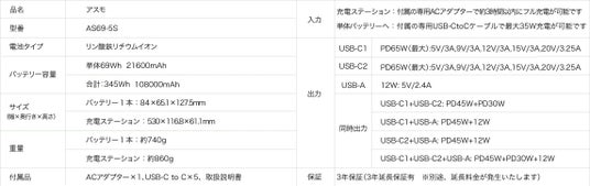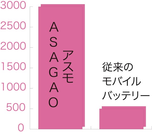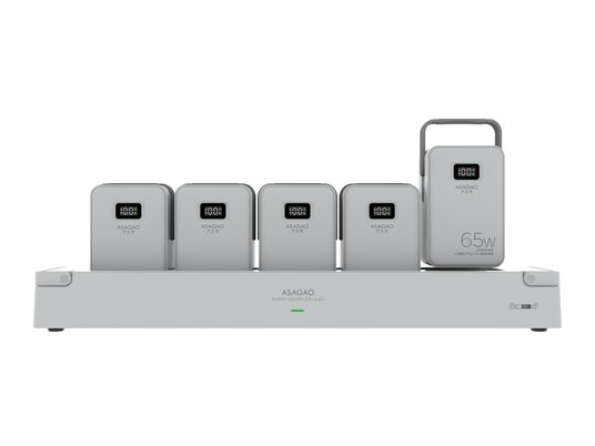 ASAGAO アスモは、高い安全性と充電サイクル約3000回以上の長寿命を両立させる”リン酸鉄リチウムイオン電池”を採用したモバイルバッテリー5台と、モバイルバッテリーを置くだけで簡単に充電できる接点式の充電ステーションがセットになった高性能電源ソリューション製品です。