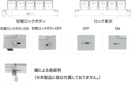 充電ステーション本体にはロックスイッチを採用。 モバイルバッテリーを固定するほか、キーホールに 鍵を付ければ盗難防止策としても使用できます。