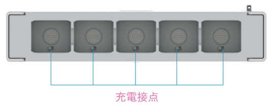 充電ステーションは接点式で、モバイルバッテリーを置くだけ で簡単に充電できます。本体の左右端にハンドルがついており、 充電ステーションの持ち運びもラクラクです。