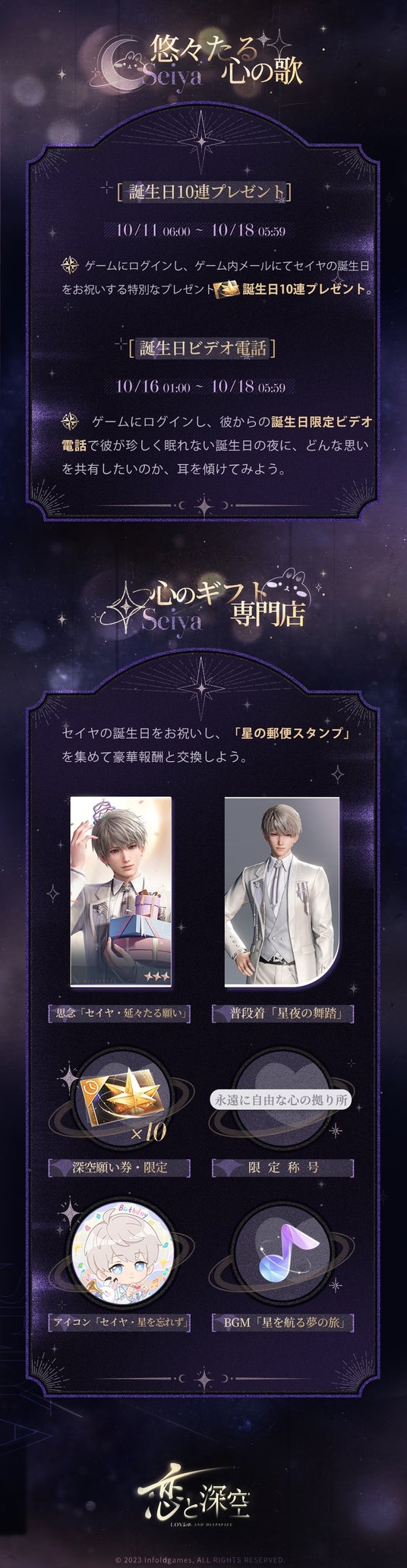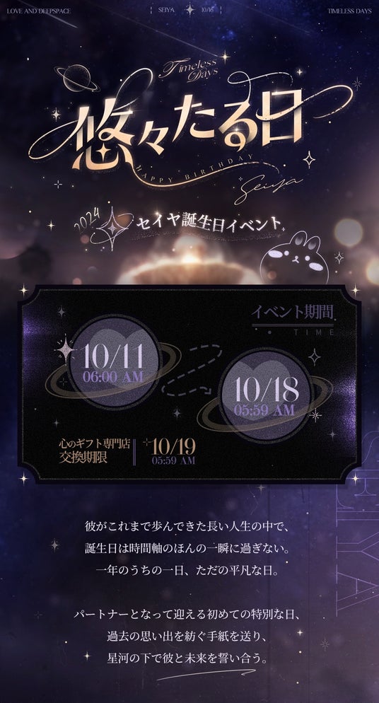 INFOLD PTE. LTD.は、全世界1億DLを突破した『恋とプロデューサー』の世界観を継承した完全新作恋愛シミュレーションゲーム『恋と深空』において、10月11日(金)6時よりセイヤ誕生日イベント「悠々たる日」を開催することをお知らせいたします。