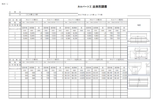 そこで、コンクリート工事における出来形調書のパターンを整理し、下図に示す通り、標準的な出来形調書の様式を定めました。