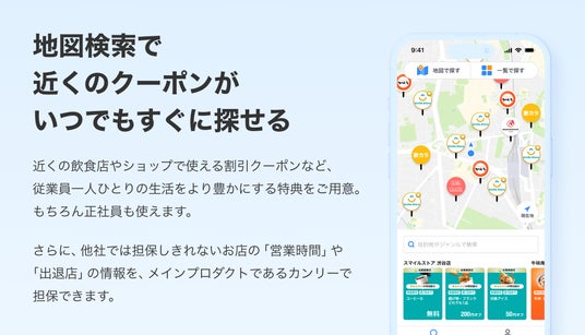 サービス導入企業の従業員は、現在地周辺で限定優待が使えるお店を探し、様々なサービスを安価で利用することができます。