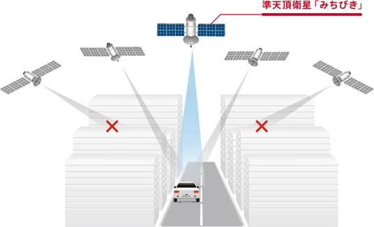 「みちびき」は日本のほぼ真上を通過する衛星のため、高層ビル街や山間部などGPSを受信しにくい場所でも受信でき、測位精度の向上に効果を発揮します。