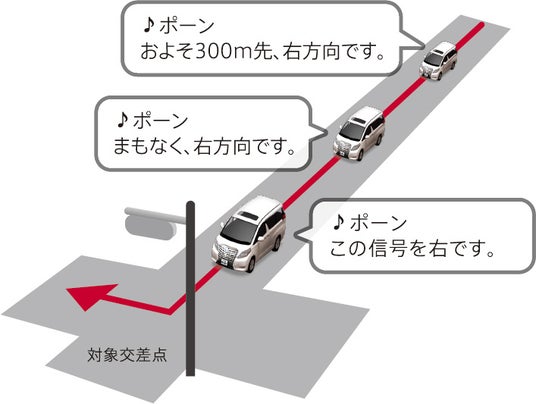案内交差点の直前になると音声とコーション音で対象交差点をお知らせします。信号機がある交差点の場合、信号機を目安に案内するのでさらにわかりやすくなっています。
