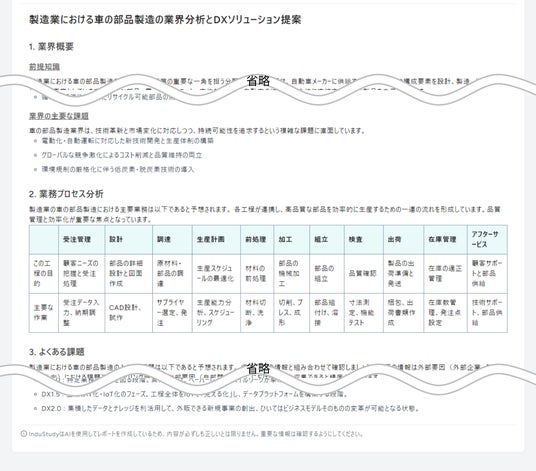 「InduStudy」は、業界分析とDXアプローチ提案をわずか60秒で生成できるDXコンサルタントのナレッジを学習したレポート生成AIツールです。本レポートには、業界概要・最近の動向・課題・業務プロセス・DXソリューションなどが含まれます。