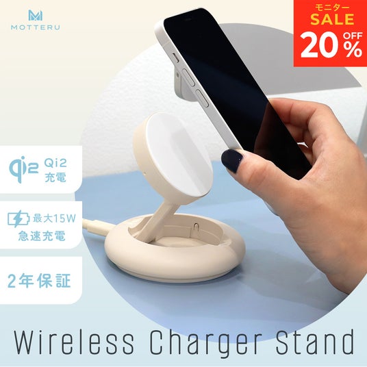 マグネット式ワイヤレス充電器ワイヤレス充電がさらに簡単にできるQi2対応充電器です。磁石の力で端末の充電位置に近づけるだけで、ピタッと装着可能です。