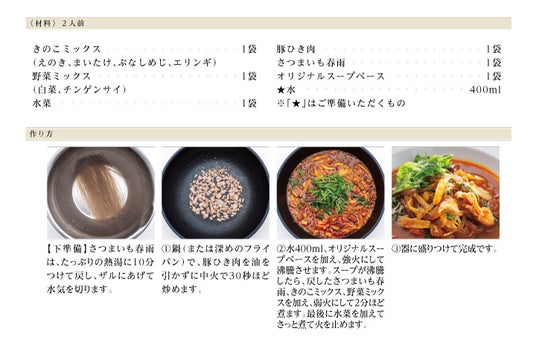 たっぷりの野菜が摂れてカラダも温まる嬉しいスープです。えのき・まいたけ・ぶなしめじ・エリンギの4種きのこが楽しめます。歯ごたえのあるさつまいも春雨にスパイスがよく絡み、刺激的で独自の風味を追求しました。