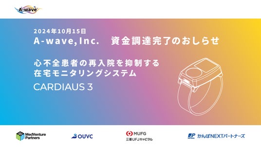 A-wave株式会社(本社:大阪府大阪市、代表取締役社長:桝田浩禎、以下「A-wave」)は、この度、MedVenture Partners株式会社、大阪大学ベンチャーキャピタル株式会社、三菱UFJキャピタル株式会社、かんぽNEXTパートナーズ株式会社が管理・運営する投資事業有限責任組合からの出資を受け、総額2億円の第三者割当増資を完了しました。A-waveは、増加する心不全患者に対し、再入院を抑制するための医療機器を提供するべく、医師の高度な診断技術に基づく在宅モニタリングシステムの開発を行っています。
