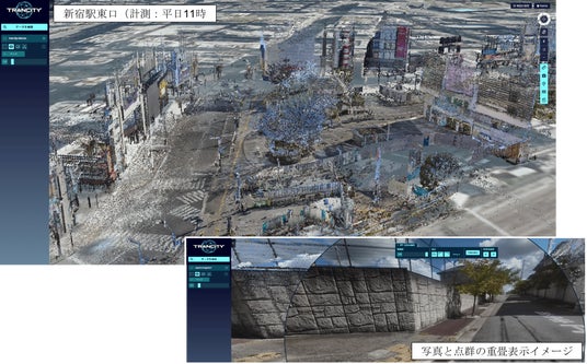 JR東日本グループとの合弁会社で、当社の関連会社であるCalTaが提供するデジタルツインプラットフォーム「TRANCITY」とマップフォーの3次元データ計測システム「SEAMS」を、Liberawareの映像処理技術によって融合する本サービスは、専門的な知識や高機能なPCが不要なうえ、歩行計測→データアップロードの内業いらずの簡単なステップで、ノイズが除去された高精細な点群データと写真データを地図上に重ね合わせたデジタルツインを自動生成します。3次元点群データの利活用をより手軽に低コストで実現し、インフラ現場管理の生産性向上に貢献します。