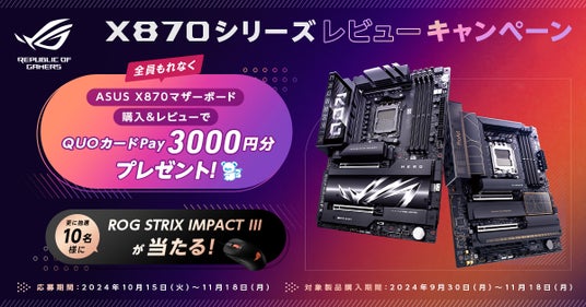 ASUS JAPAN株式会社は、X870シリーズマザーボードの購入&レビューで、応募者全員にQUOカードPay 3,000円分、抽選で10名様にROG STRIX IMPACT IIIが当たるキャンペーンを2024年10月15日(火)より開催します。