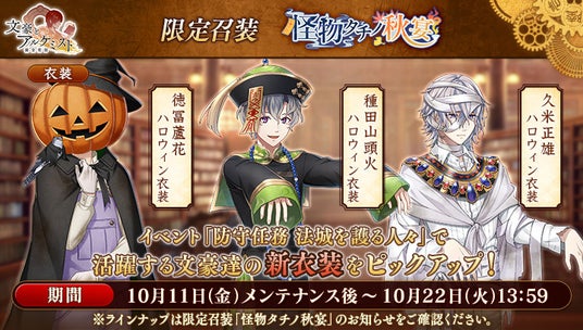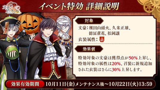 さらに、イベントと同時に開催される限定召装『怪物タチノ秋宴』にて新規追加された「種田山頭火」「久米正雄」「徳冨蘆花」の〈ハロウィン衣装〉を編成すると、得点の獲得率がそれぞれ30%上昇します。