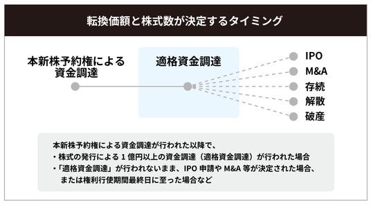 株式への転換価額とその交付株式数は、一定の条件を満たす次回以降の資金調達(適格資金調達)時に決定されます。実際に、株式に転換するタイミングは、将来のIPOやM&Aなどのイベント時になります。転換価格については評価額上限(Cap)と割引(Discount)が設定され、投資家は早期に投資したことに対するインセンティブを受けられる設計となっています。適格資金調達が行われないまま、IPOやM&Aに至った場合は、評価額上限を用いて転換価額が決定されます。