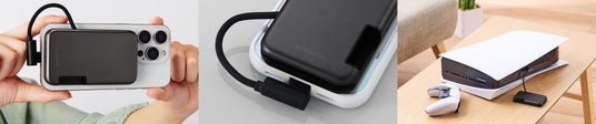 ▲ USB Type-C(USB-C)コネクターを搭載 ▲ 接続時に出っ張りの少ないL字型コネクターを採用 ▲ iPhoneにフィットする丸みを帯びたデザインで、iPhoneのマグネットに装着可能 ▲ 未使用時はコード部分を本体に収納可能