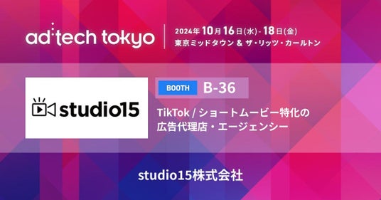TikTokを中心としたショートムービー(短尺動画)領域で広告代理店事業・プロダクション事業を展開するstudio15株式会社(本社:東京都渋谷区、代表取締役:岩佐 琢磨、以下studio15)は、2024年10月17日(木)・18日(金)に東京ミッドタウンおよびザ・リッツ・カールトンにて開催される「adtech tokyo 2024」へ出展することをお知らせします。