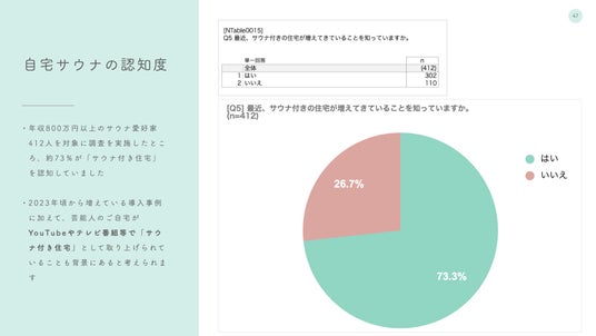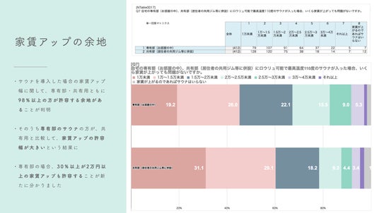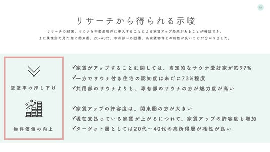他方、マンションデベロッパーにとっては、サウナを導入することで「空室率改善」「家賃アップ」といった2つのメリットを期待できる可能性があることが、本調査を通じて分かりました。