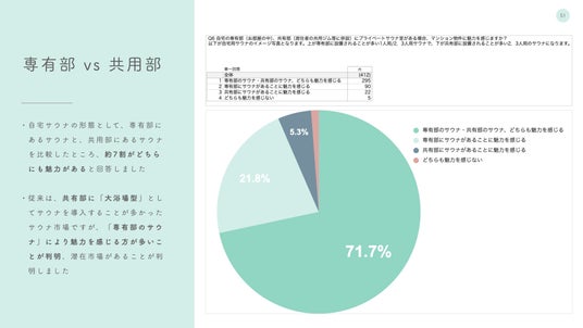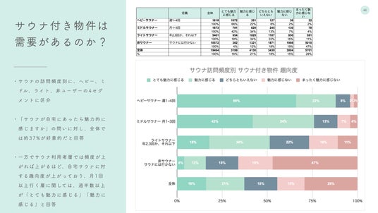 また、その中でも、共用部の大浴場型サウナよりも自宅内に専用のサウナがあることにより大きな魅力を感じる人が多いという傾向も明らかになりました。