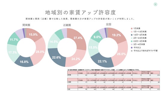 関東圏の54%以上が1.5万円以上の家賃アップを、うち約37%が2万円以上の家賃アップを許容しており、これは全国平均(1.5万以上:約53%、2万以上:約31%)と比較しても高い結果となっています。