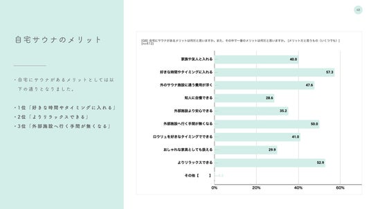 この結果から、自宅にサウナを設置する最大のメリットは、施設の営業時間や滞在時間の制限に縛られることなく、好きなタイミング、かつプライベートな空間で、よりリラックスできる点にあることが推測されます。