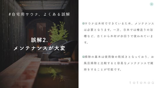 今回文中で紹介した市場調査結果は、デベロッパー事業者向けに開催したウェビナー「【サウナ×不動産】サウナ活用でマンション物件の空室改善&賃料アップ」にて先行発表しております。今回、ウェビナー資料を一般向けにも公開。無償でダウンロードいただけますので、詳しくはtotonoüのカタログダウンロードフォームより、お申し込みください。