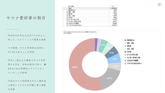 今回の調査では、まず19,464人を対象にサウナ利用状況のスクリーニング調査を実施しました。その結果、回答者の半数近い水準である45.6%が定期的にサウナを利用していることが明らかになりました。さらに、28.9%が半年に一度以上の頻度でサウナを利用しており、およそ4人に1人が日常生活の中に積極的にサウナを取り入れていることがわかります。