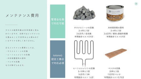 最も消耗するのがサウナストーンで、利用度合いに応じて2~4年単位での交換が必要となります。また、サウナを長持ちさせるために木材保護のための塗料を塗布するという選択肢もあります。ただし、これらの作業は管理組合や清掃事業者側でも対応が可能なシンプルな作業です。