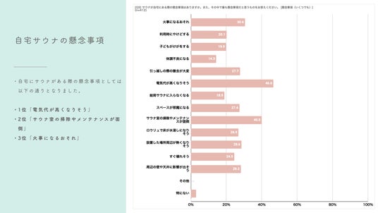 一方、自宅サウナに関する懸念事項として多くの回答者が挙げたのは以下の点です。