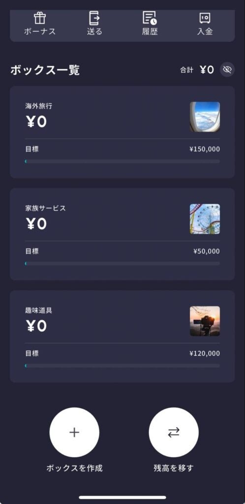 ・海外旅行費用、豪華ホテル宿泊費用、運転免許費用、美容クリニック費用など、目的別のボックスを設定し、自動積立を設定することで未来の出費に向けて貯めておく