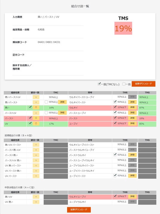 そこで、TM-RoBoの商標検索機能における組合せ語作成機能をバージョンアップし、B+A型、A+C型の組合せ語を網羅的に作成し、類似検索を行う組み合わせ語拡張機能を開発し、観念類似調査にも対応することにいたしました。