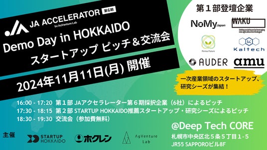 この度、本JAアクセラレーター北海道枠採択スタートアップに加え、北海道内で実証実験を展開するスタートアップの取り組みを発信する成果発表イベント(Demo Day)を11月11日(月)に札幌市内で開催します。